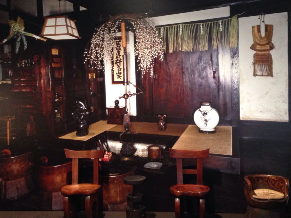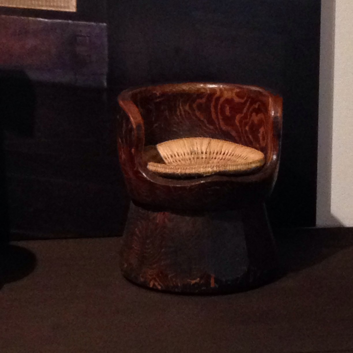 これは、臼形椅子です。すっぽり入る感じで、なかなかの座り心地。これも、下の椅子も全部、河井さんの作品。底面にコロがついているのですが、それも当然木で作られていました。